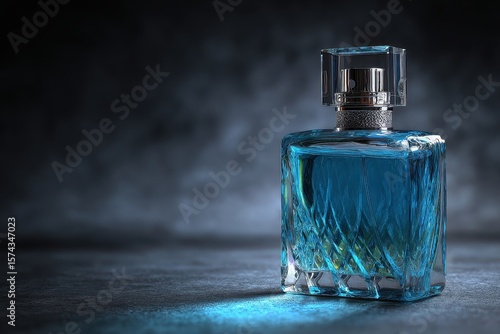 Square, crystalline perfume bottle filled with light blue liquid, against a dark background