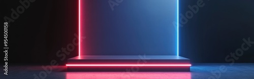 Square pedestal with blue neon lights on a gray background 3D rendering