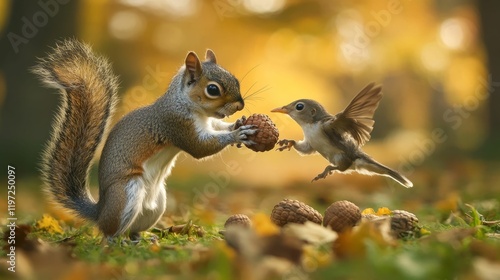 Squirrel and bird interact with a nut on ground.