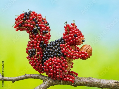 Squirrel Figurine Constructed from Red and Black Currants Holding a Nut