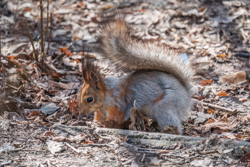 Squirrel in autumn or spring hides nuts on the green grass with fallen yellow leaves