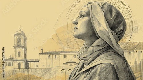 St. Catherine of Ricci in Vision in 16th-Century Italian Convent, Biblical Illustration, Beige Background, Copyspace
