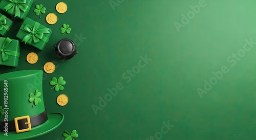 St patrick's day green background with shamrocks coins and leprechaun hat