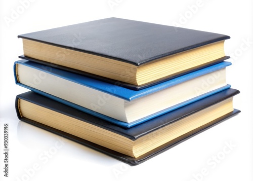 Stack of blue and black hardcover books with blank white covers and yellowed pages against a clean white background, evoking a sense of knowledge and learning.