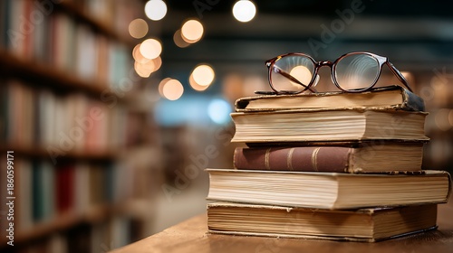 Stack of books topped with eyeglasses in a library setting, with blurry background lights