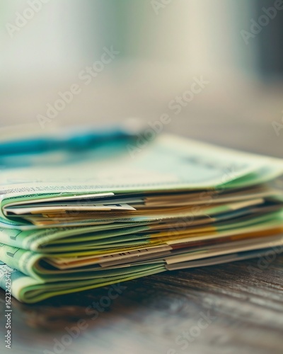 Stack of colorful banknotes on a rustic wooden desk, close-up