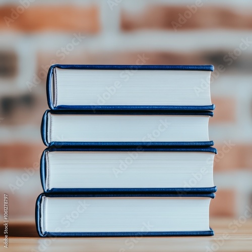 Stack of four hardcover books with blue covers and white spines against a blurred brick background.