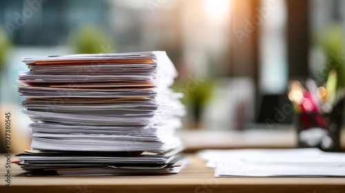 Stack of papers on office table shows workload under natural light in a busy environment