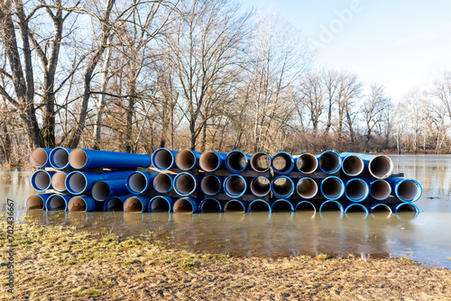 Stack of pipes waiting on a construction and the trees on the river bank was flooded by the river.