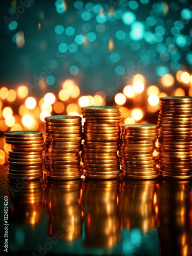 Stack of Shiny Gold Coins with Glowing Bokeh Background, Symbolizing Wealth and Prosperity