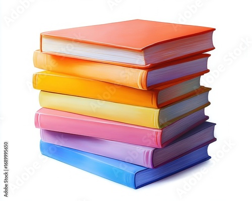 Stack of six hardcover books arranged vertically with vibrant orange, yellow, pink, purple, and blue covers against a white background