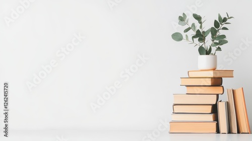 Stacked books and potted plant in minimalist home office setting