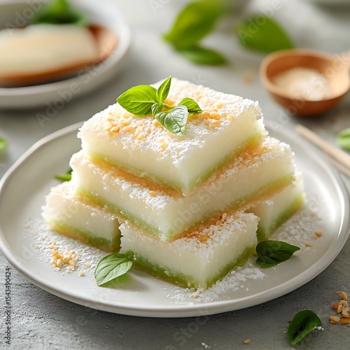 Stacked Coconut Agar Agar Dessert with Basil Leaves on White Plate, CloseUp View