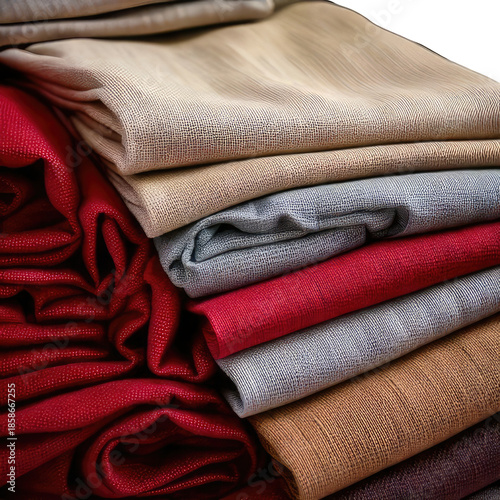 Stacked, folded textiles of varying warm hues