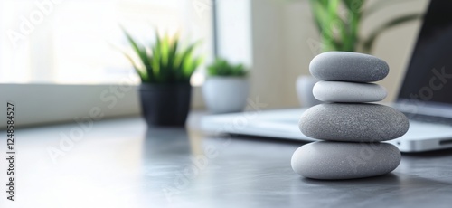 stacked gray stones symbolizing balance and tranquility in modern workspace, copy space for text
