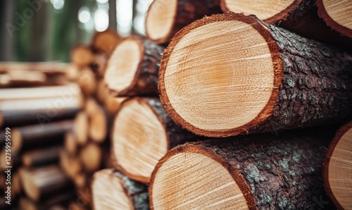 Stacked logs in a serene forest setting with soft sunlight filtering through trees