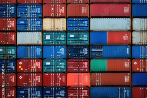Stacked Shipping Cargo Freight Container. Stacked Cargo Shipping Containers Global Trade Logistics. Stack of Cargo Containers. Global Cargo import and Export Logistics Concept with Copy Space.