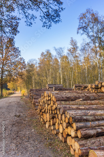 Stacked trees at a walking path in the forest of Borger, Netherlands