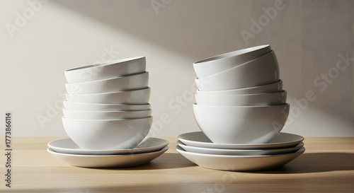 Stacked White Ceramic Bowls and Plates on Wooden Surface in Natural Light
