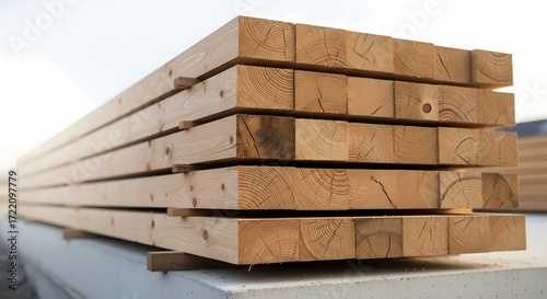 Stacked wooden planks arranged neatly on a construction site. The lumber is light brown with visible grain patterns, ready for building projects.