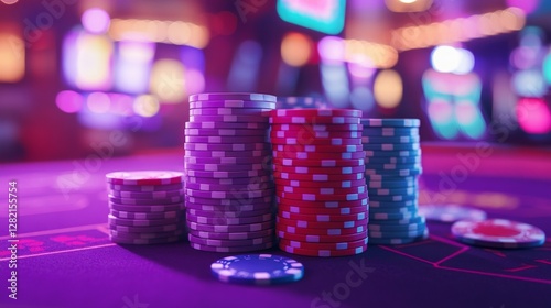 Stacks of colorful poker chips on a casino table during an exciting gaming session in the evening
