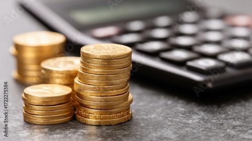 Stacks of gold coins beside a calculator on a dark stone surface symbolizing financial calculations and wealth management
