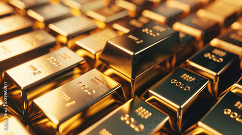 Stacks of pure gold bar on dark background. Represent business and finance concept idea, generative ai