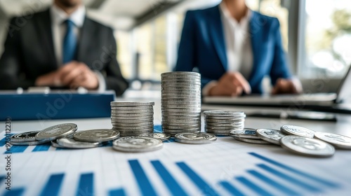 Stacks of Silver Coins on a Blue Bar Chart with Blurred Business Professionals in the Background
