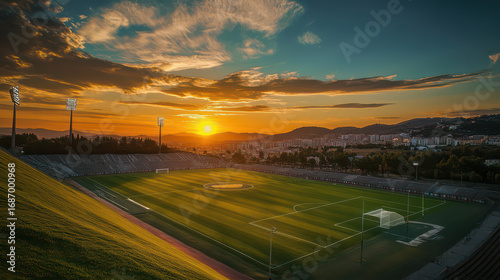 Stadium at Sunset: Witness the serene twilight over an expansive stadium with verdant playing field as the sun paints the sky in warm, golden hues.