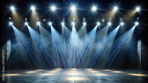 Stage with bright lights converging from multiple angles on a darkened floor