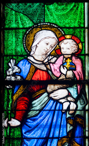 Stained glass (19th century) of Blessed Virgin Mary holding baby Jesus Christ in her arms.