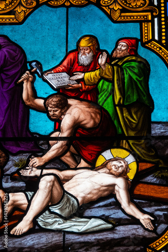 Stained glass (19th century) of The Way of the Cross. Eleventh station: Jesus is nailed to the cross.