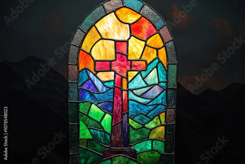 Stained Glass Mountain Scene - Cross at Sunset