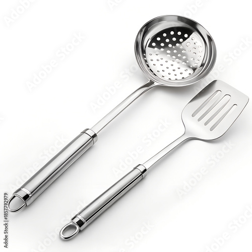 Stainless Steel Kitchen Utensils Slotted Spoon and Turner Spatula Isolated on White Background