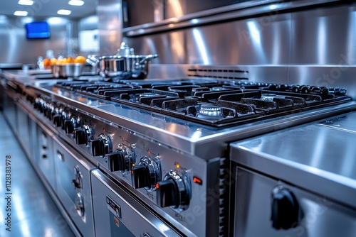 Stainless steel professional kitchen featuring sleek appliances and a clean design.