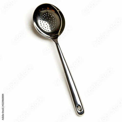 Stainless steel slotted spoon, kitchen utensil, white background, cooking