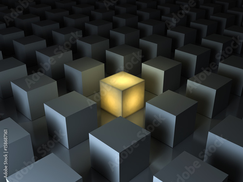 Stand out from the crowd and different creative idea concepts , One glowing yellow light cube among other dim cubes on dark gray background with reflections and shadows . 3D rendering.