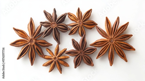 Star anise spice isolated on white background, top view of aromatic whole pods for culinary, herbal, and natural medicine uses, perfect for food photography and spices-themed designs
