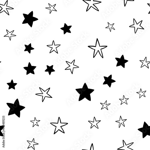 Star doodles seamless pattern. Hand drawn stars illustrations, background texture. Monochromatic.