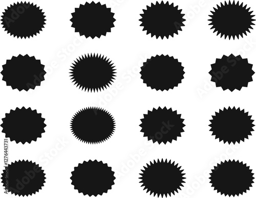 Starburst red sticker set - collection of special offer sale oval and round shaped sunburst labels and badges. Promo stickers with star edges. Vector.