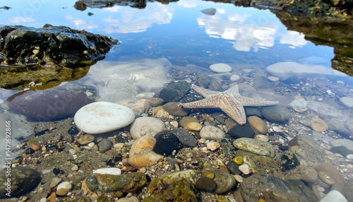 Starfish in Tide Pool: A delicate starfish lies nestled among smooth pebbles in a shallow tide pool. The clear water reflects the blue sky and white clouds above.