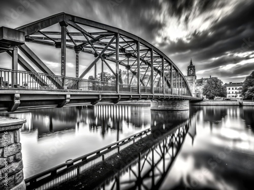 Stark black and white captures Turku's steel bridge, a Finnish river landscape's dramatic beauty.