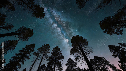 Starry night sky framed by pine forest with Milky Way view