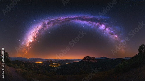 Starry Night with Milky Way Arc Above Rolling Hills and Horizon Glow