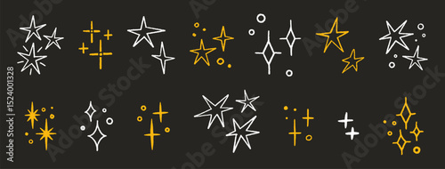 Stars set, crayon hand drawn. Magic gold and white twinkle icons, contour. Shine, spark or light, chalk elements on black background. Sketch sparkles. Glitter doodle sparks. Vector illustration