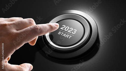 Start 2023. Happy New Year button. 3D illustration