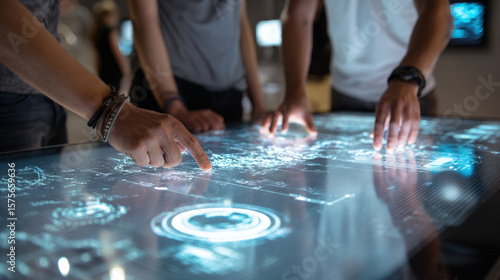 Startup team collaborating around futuristic touchscreen table with holographic display