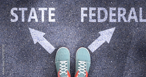 State and federal as different choices in life - pictured as words State, federal on a road to symbolize making decision and picking either State or federal as an option, 3d illustration
