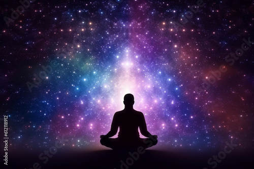 State of mind concept. Transcendental chakras space meditation human silhouette. Cosmic background. Generative AI