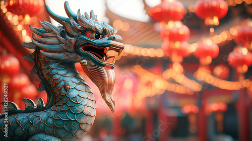 Statue of a dragon and Chinese lanterns. Celebration of the Chinese New Year, year of the Dragon